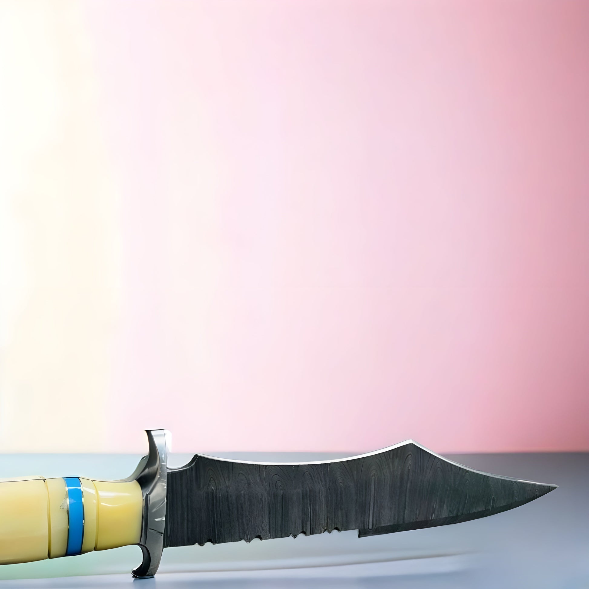 Custom Damascus Bowie with Unique Handle and Distinctive Blade Design