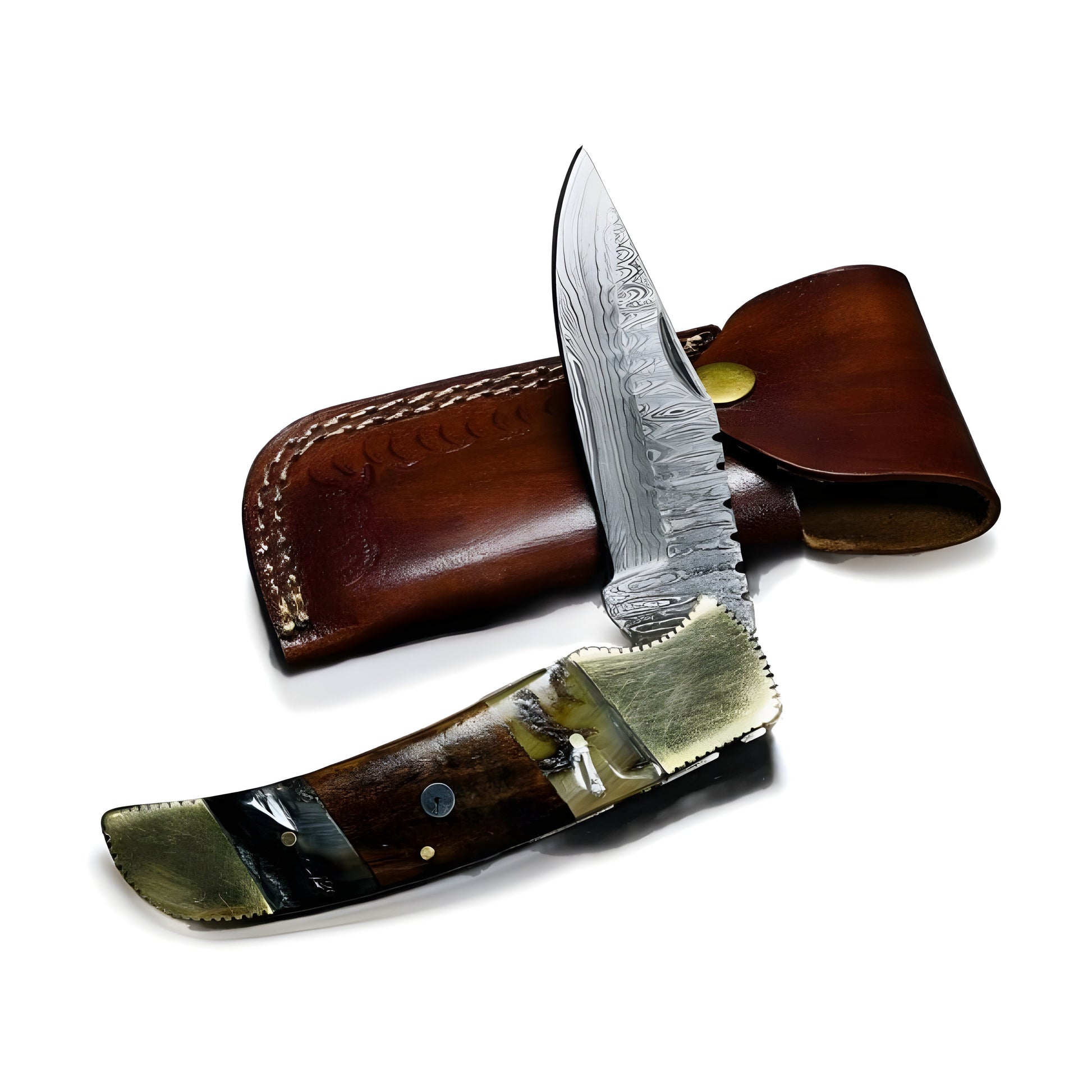 This Custom Handmade Pocket Knife features a stunning Damascus steel blade paired with a luxurious abalone shell handle, combining elegance with performance. The drop-point blade offers excellent versatility, while the intricate file work on the tang and spine adds a touch of artisanal craftsmanship—perfect for everyday carry or as a collector’s piece.